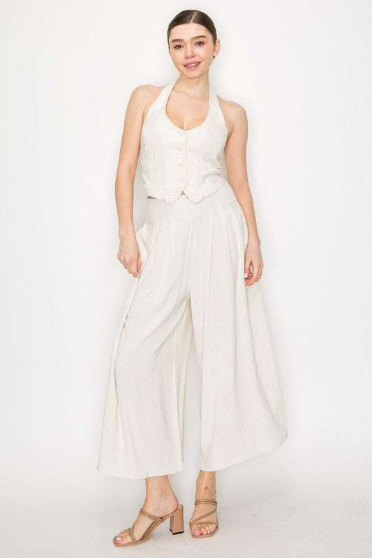 Dare to turn heads in this bold halter top that commands attention from every angle. The open-back design and cropped silhouette deliver modern edge, while the soft, textured linen-like fabric drapes with effortless sophistication. Button-down closure offers versatile styling—wear it buttoned for refined control or open for maximum impact. Perfect for athletes and trendsetters who refuse to blend in.