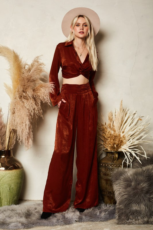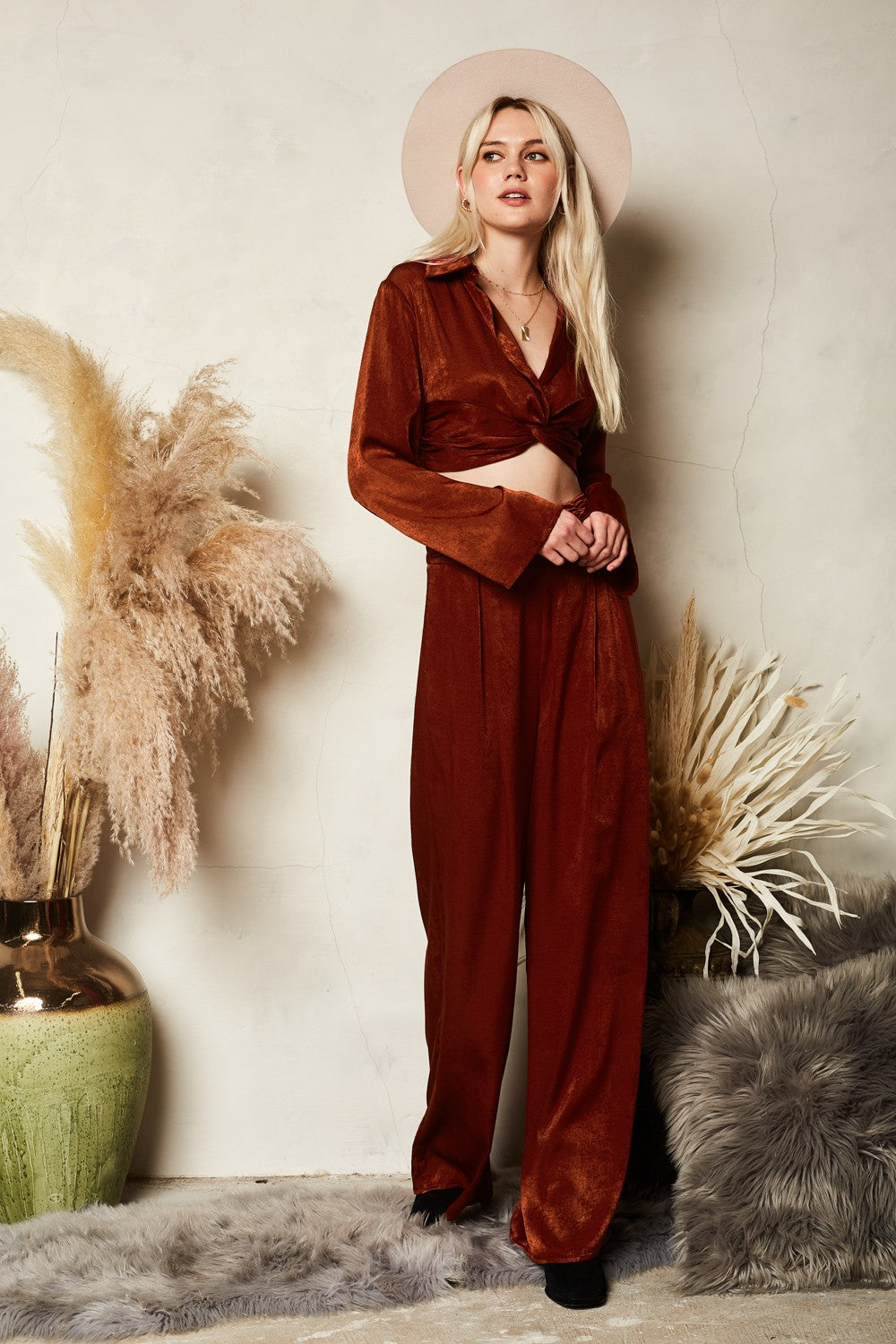 Turn heads in this luxe, rust-colored satin crop top that brings vintage flair and modern edge together. Featuring a twisted front detail and an open, collared neckline, this top exudes effortless cool with a slightly retro vibe. The long, relaxed sleeves balance the cropped hem, making it a perfect match for high-waisted trousers or skirts. Whether you're styling it for a night out or a chic daytime look, this silky piece adds instant sophistication.