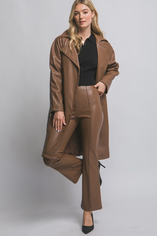 These flared pleather pants feature a mid-rise fit with a convenient side zipper and stylish piping details that enhance their sleek design. Crafted from a very soft, cruelty-free material, they provide comfort without compromising on ethics. Perfect for those seeking both style and responsible fashion.