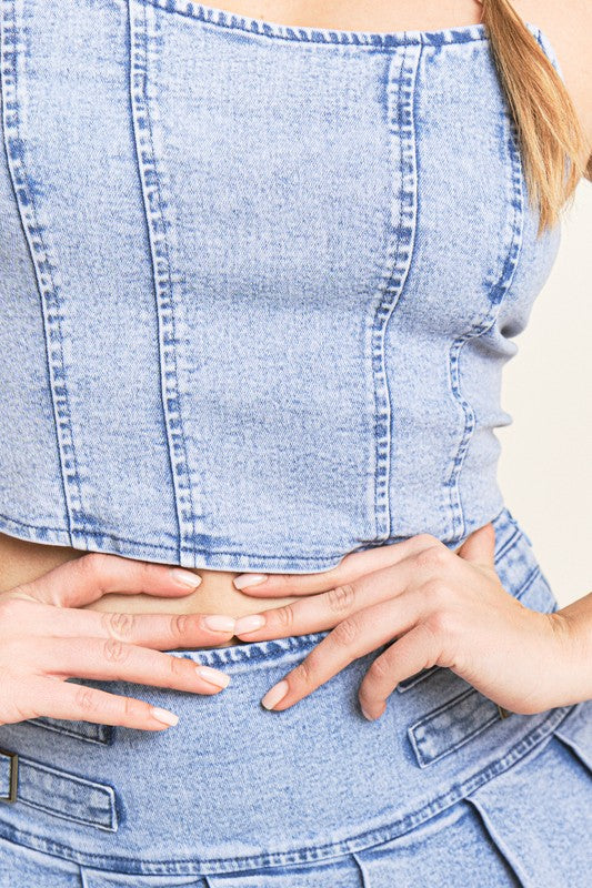 This denim corset top features a back zipper closure with elastic for a comfortable, secure fit. The boned bodice provides structured support, enhancing your silhouette with style and confidence. Perfect for pairing with the matching pleated mini skirt or wearing on its own for a chic, versatile look.
